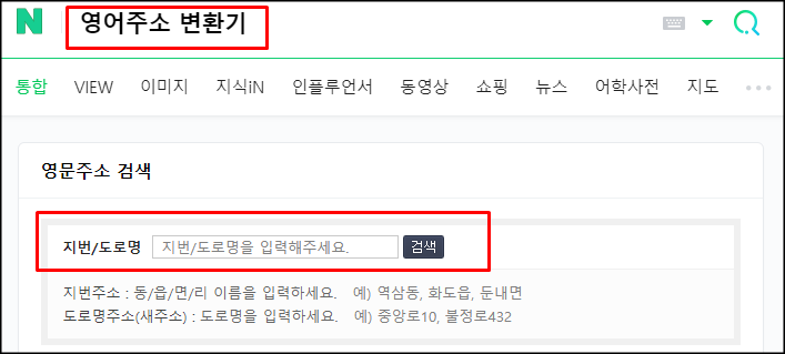 1. 포털사이트 검색창에 [영어주소 변환기]등의 문구를 입력하면 영문주소 검색창이 나옵니다.