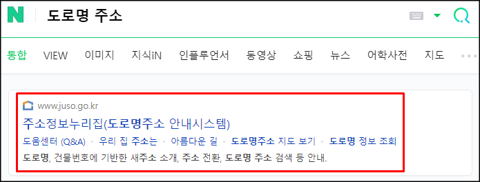 1. 포털사이트 검색창에 [도로명 주소]를 검색하면 [주소정보누리집(도로명주소 안내시스템)]사이트가 나옵니다.