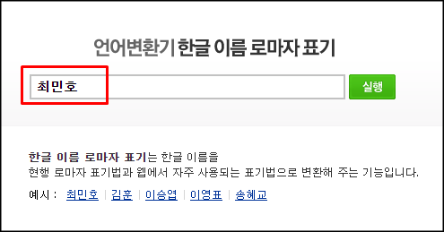 한글 이름 로마자 표기는 한글 이름을 현행 로마자 표기법과 웹에서 자주 사용되는 표기법으로 변환해 주는 기능입니다. 예시 :