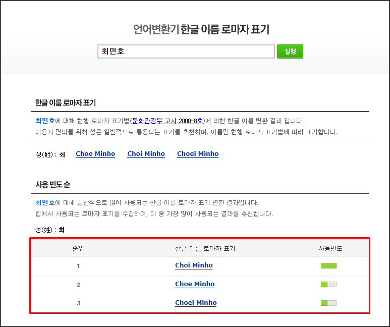 영문이름 결과는 가장 많이 사용되는 순서대로 나옵니다.