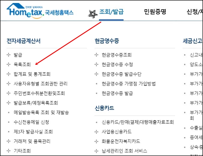1. 국세청 홈택스 로그인 후 [조회/발급] ▶ 목록조회를 눌러주세요.