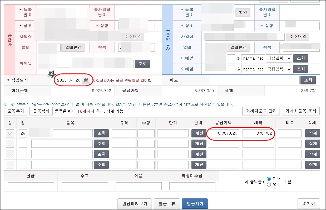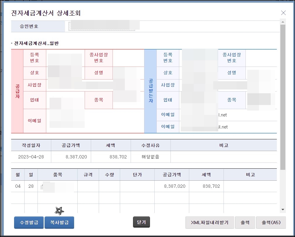 4. 복사발급시에는 작성일자와 품목, 공급가액, 세액이 동일하게 복사가 되므로 주의해야 합니다.