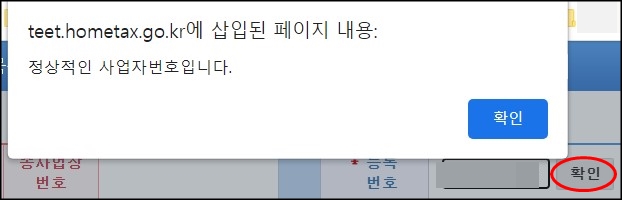 정상적인 사업자번호라면 아래와 같은 팝업이 뜹니다.