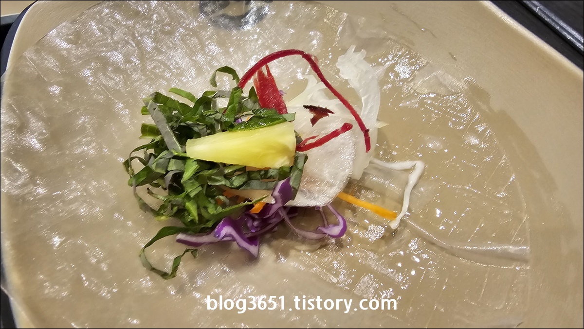 모든 메뉴에 월남쌈은 기본이라 월남쌈 채소를 담을 수 있는 그릇이 테이블마다 준비되어 있어요.