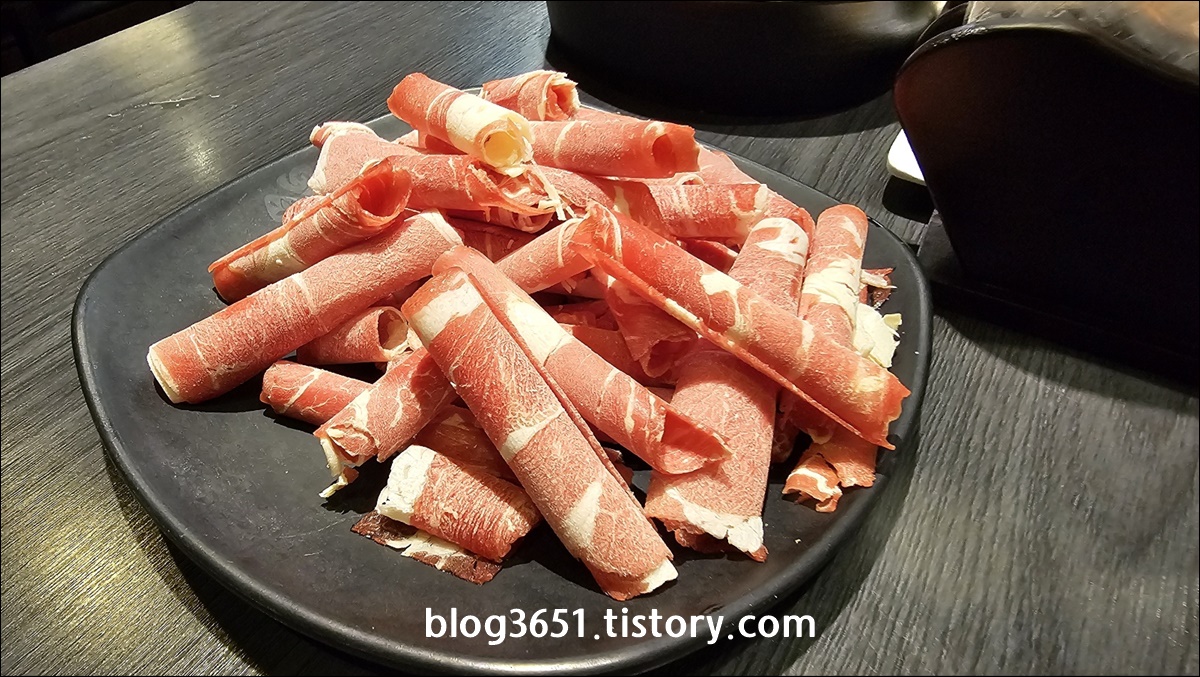 샤브샤브 육수는 매운맛과 순한 맛 반반이라 색이 다릅니다.