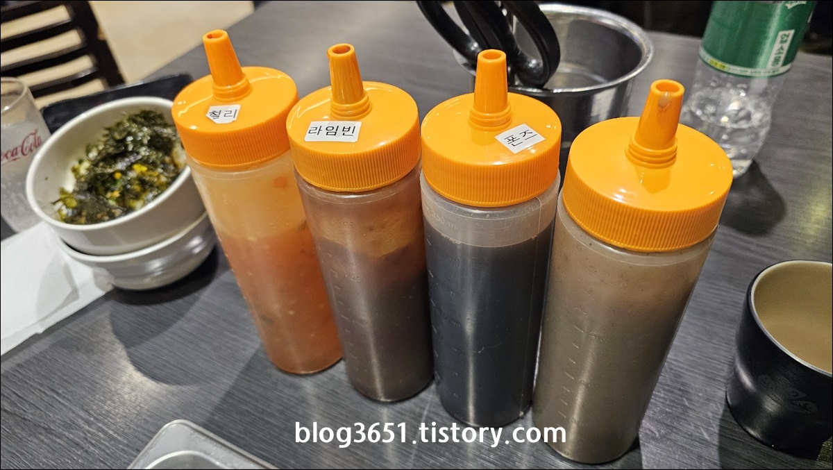 테이블에는 샤브샤브 소스와 월남쌈 소스가 준비되어 있고, 종류는 총 네 가지입니다.