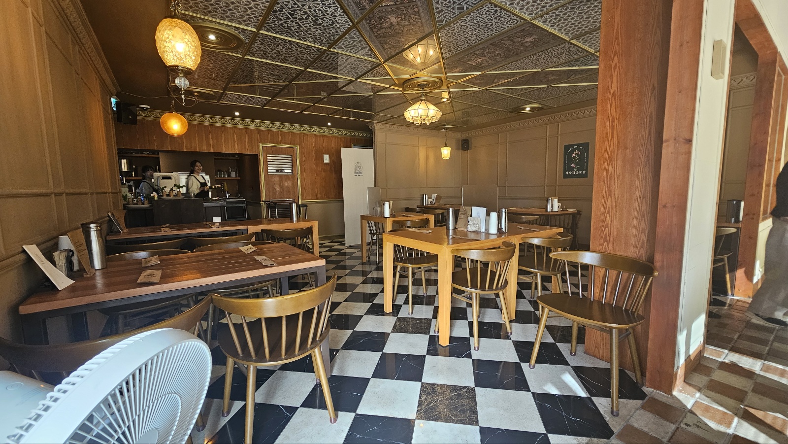식사를 할 수 있는 2층에는 10개 정도의 테이블이 있고, 화장실은 남녀 구분되어 있어요.