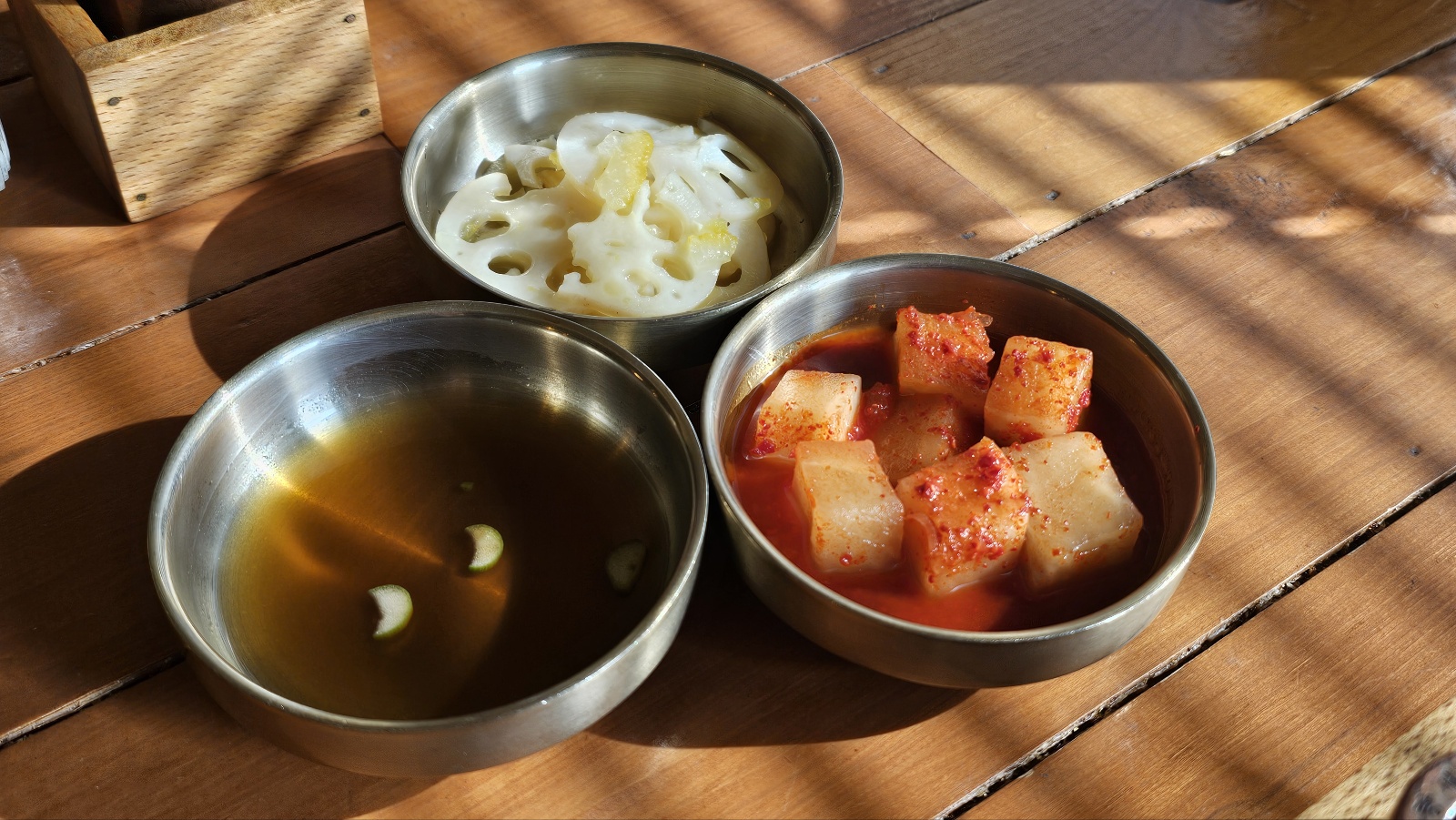 위 사진에 보이는 간장은 전을 찍어 먹는 것이고, 밑반찬으로는 깍두기와 연근이 나왔어요.