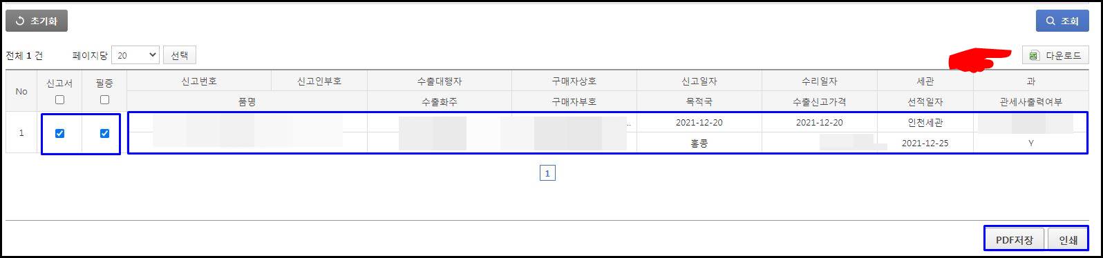 수출 신고서나 필증을 파일로 저장하고 싶다면 'PDF저장'을 누르면 되고, 바로 인쇄를 하고 싶다면 '인쇄'를 누르면 됩니다.