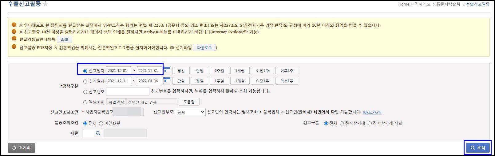 참고로 다운로드는 신고서나 필증이 엑셀로 보이는 게 아니라 화면에 보이는 신고번호, 신고일자 등의 내용들만 보입니다.