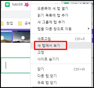 크롬에서는 똑같이 마우스 우클릭을 한 후 '새 탭에서 보기'를 클릭하면 됩니다.